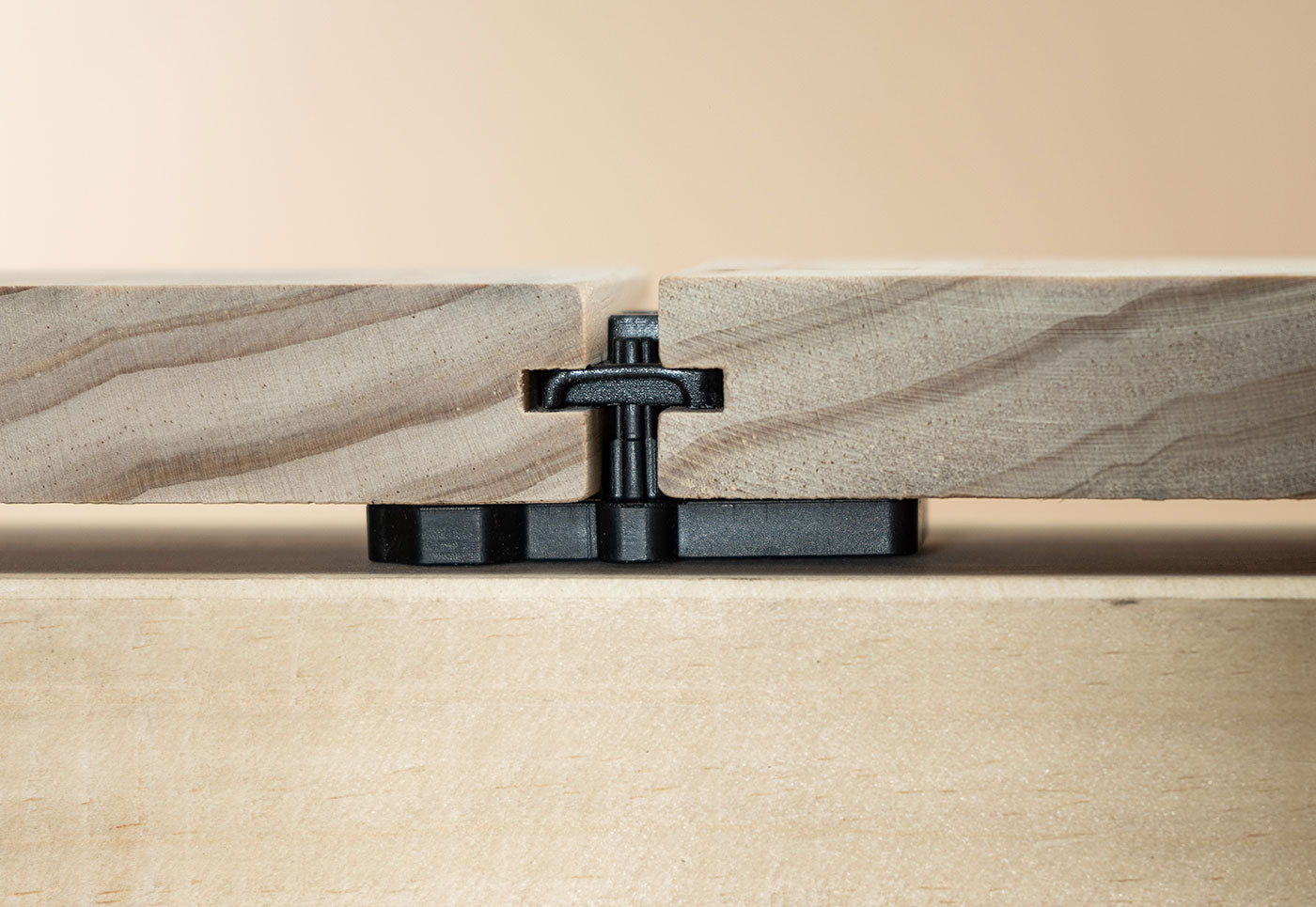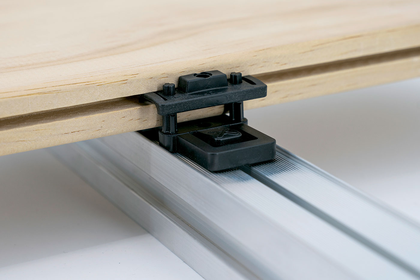 Bei LIGO C sorgt eine aus Kunststoff gefertigte Nutplatte, mit einer massiv ausgeführten Schraubzone, für eine optimale Kraftübertragung in die Nutaufnahme der Dielen.